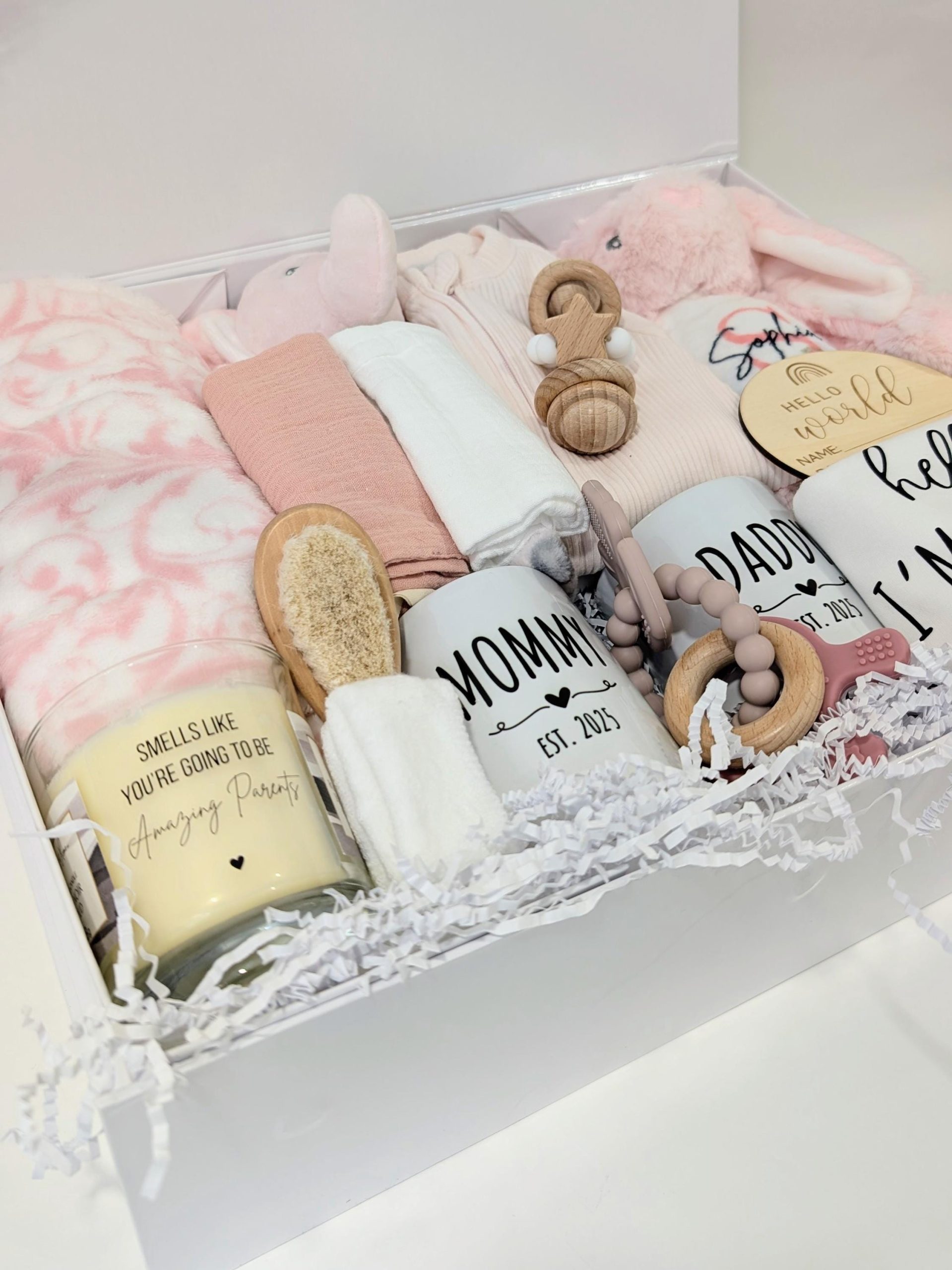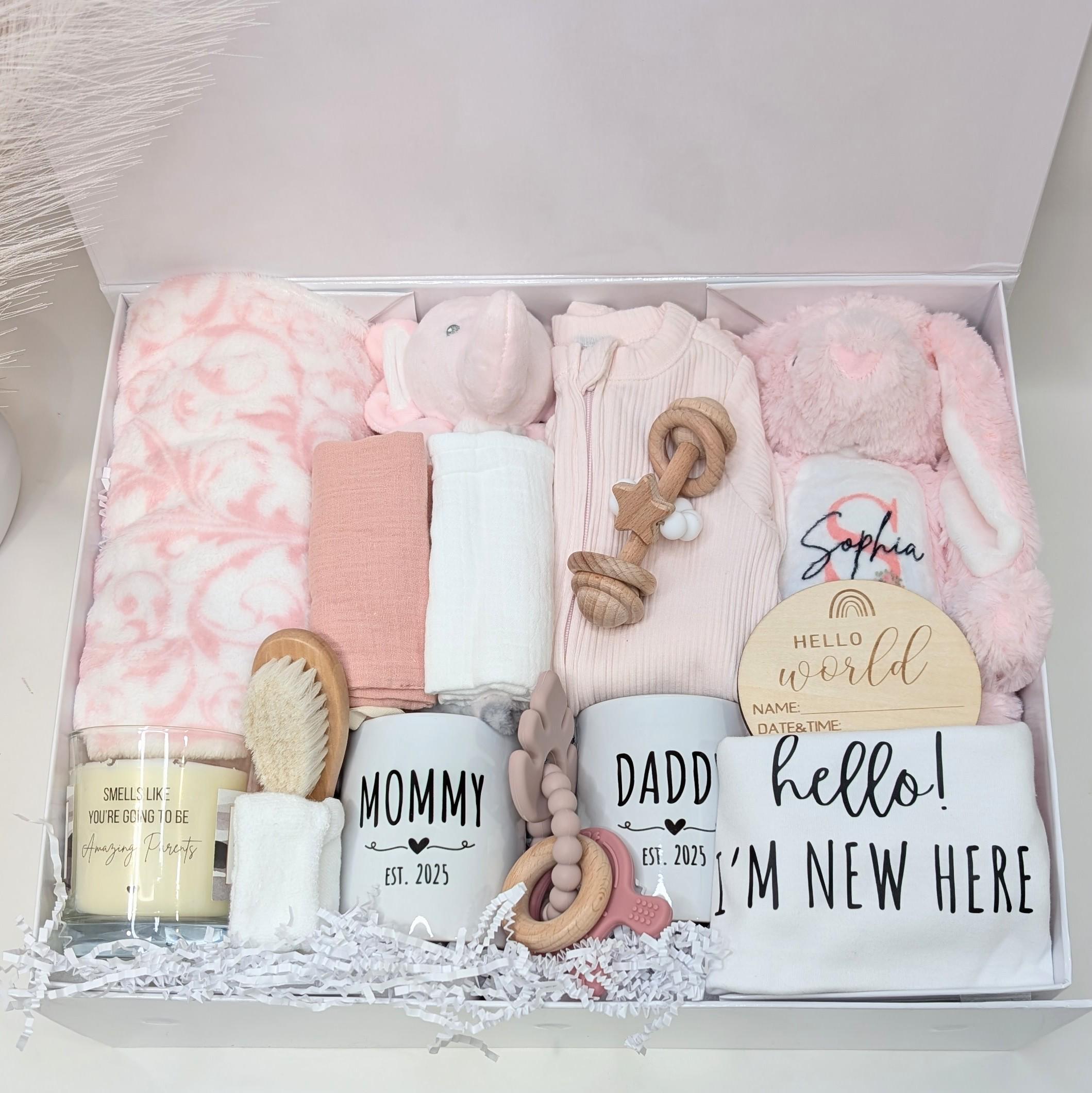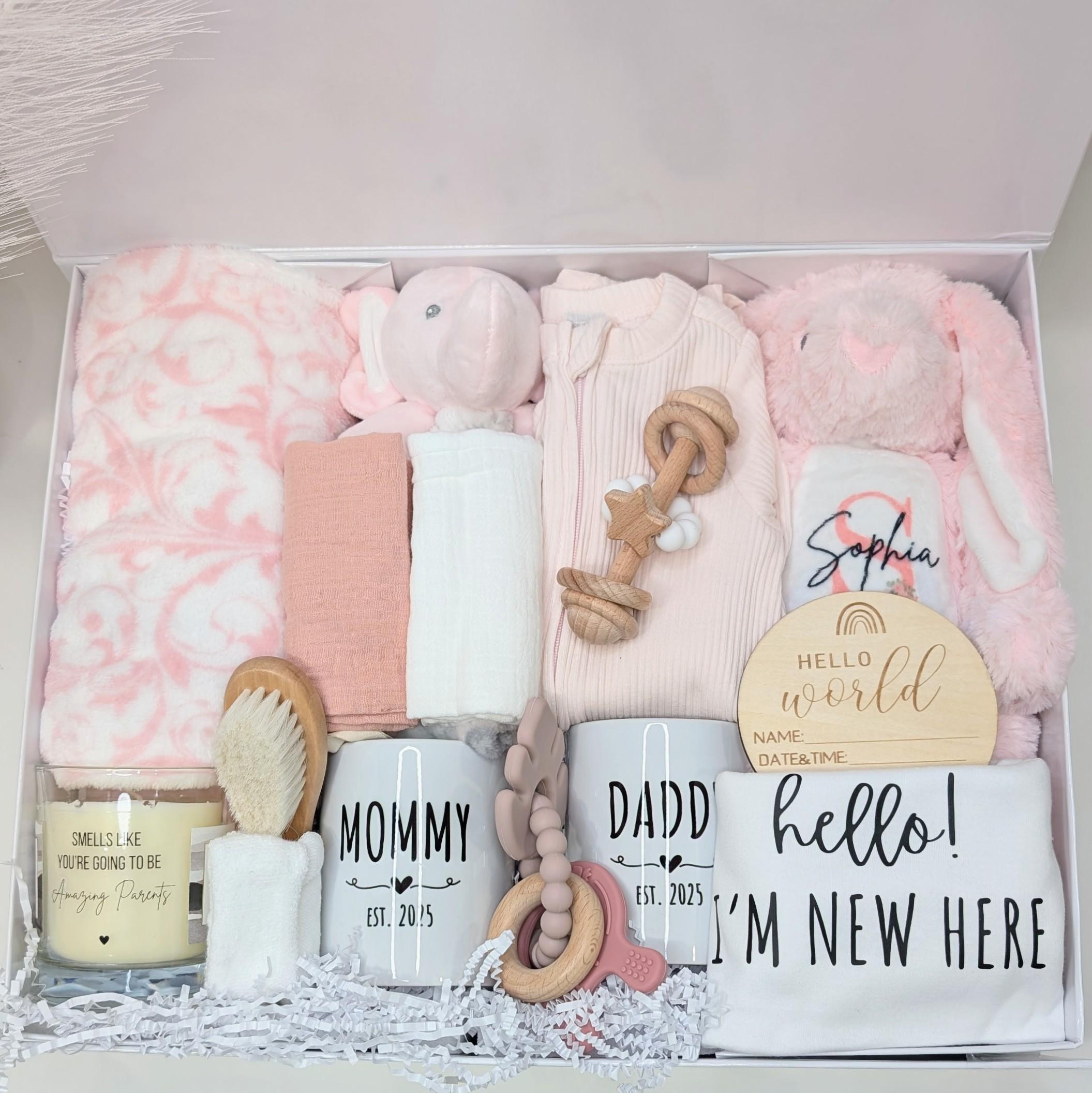 Premium Baby Girl Gift Box, Gender Neutral, Custom bunny,Baby Essentials, Baby Shower gift, Baby Announcement card, Hello I'm new here